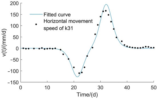 Within the region where x > D, the dynamic horizontal movement is represented using model (17) and the parameters are determined by fitting the measured values through the least squares method. In the fully mined area, as the working face progresses, the surface points on the strike line initially move in the opposite direction and subsequently change their direction of movement towards the advance. The changing process of moving speed is 0 → → 0 → → 0 (with the advance direction being positive). During mining operations directly beneath a surface point and its subsequent advancement, the subsidence speed of that point reaches its highest value, while the horizontal movement speed gradually diminishes until it reaches 0. At this juncture, the surface point reaches its maximum horizontal displacement in the opposite direction of the mining advance. As the mining face continues to progress, the movement of the surface point aligns with the direction of advancement [37]. Once the surface stabilizes, the surface points are generally not positioned directly below their initial location and there remains a horizontal movement termed “Uresidue” [37,40]. To illustrate, Figure 12 displays the dynamic horizontal movement in the advancing direction for point K31 in the fully mined area.