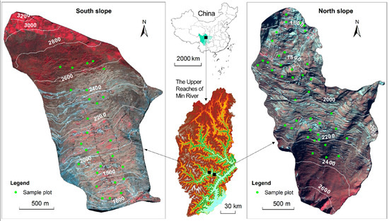 The study area is located on the slopes of both banks of the Zagunao River, a tributary of the upper Min River, on the eastern margin of the Tibetan Plateau. One is on the northern slope (31°32′32″ N, 103°26′57″ E), and another is on the southern one (31°35′1″ N, 103°19′33″ E) (Figure 1). The average annual temperature and precipitation are 6.9–11 °C and 500–600 mm, respectively, but the average evaporation is 1500 mm. The soil is yellowish-brown, shallow, and stony or gravelly, and it is classified as Haplastepts [4] by the USDA (U.S. Soil Classification System). Native vegetation types include mesophytes and drought-tolerant plants adapted to arid mountainous regions [3].