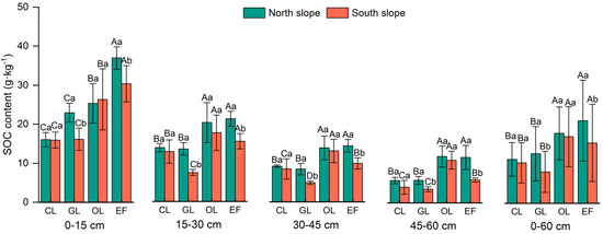 Differences in SOC contents between slope aspects and among land-use types. (Different lowercase letters indicate significant differences in SOC contents between the northern and southern slopes in the same land-use type; different capital letters indicate significant differences in SOC contents among land-use types on the same slope aspect; p < 0.05).