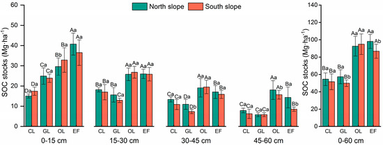 The differences in SOC stocks among land-use types varied considerably across soil horizons (Figure 3). At the 0–15 cm depth level, the order of SOC stocks was EF > OL > GL > CL; at 15–30 cm, EF ≈ OL > CL ≥ GL; at 30–45 cm, OL > EF > CL > GL; at 45–60 cm, OL > EF > GL ≈ CL. It is clear that, in the surface layer (0–15 cm), SOC stocks were higher in EF than in OL, GL, and CL; in the bottom layer (45–60 cm), SOC stocks were higher in OL than in other land types. Total SOC stocks (0–60 cm depth) in EF, OL, GL, and CL on the northern slope were 98.11 Mg ha−1, 92.56 Mg ha−1, 57.32 Mg ha−1, and 54.53 Mg ha−1, respectively, while those on the southern slope were 86.76 Mg ha−1, 94.89 Mg ha−1, 49.98 Mg ha−1, and 51.57 Mg ha−1, respectively. Total SOC stocks were higher in EF and OL than in GL and CL on both slopes, with no differences between EF and OL or between GL and CL; those in GL and EF were significantly higher on the northern slope than on the southern one, while those in CL and OL did not differ between these slopes. These results again demonstrate that EF and OL are ideal for capturing SOC, while CL and GL are not, considering the entire soil profile.