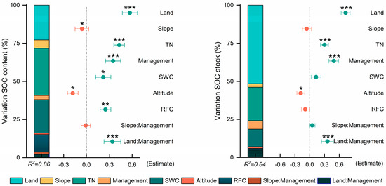 The percentage of variation in SOC content and stock was explained by factors such as land-use type, slope aspect, TN, management, RFC, SWC, altitude, and the interactions between slope aspect and management, and land type and management. (Notes: estimates are standard regression coefficients of the factors; 95% confidence intervals; p-values of regression coefficients: * p < 0.05, ** p < 0.01, *** p < 0.001. Blue dots indicate a negative effect; red dots indicate a positive one. Land indicates land-use type).