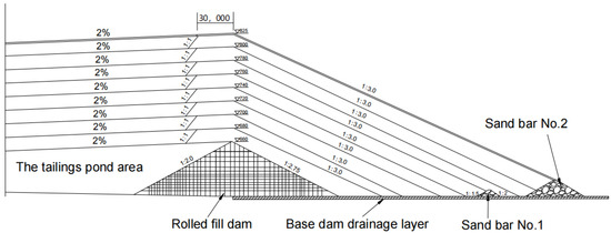 The stacking dam was built using the centerline method with tailings. The incoming tailings were classified by swirling flow, and the graded bottom flow tailings were discharged to the initial dam crest and downstream for dam construction. The overflow tailings were directly discharged into the reservoir. The final crest elevation of the accumulation dam was 825 m, the dam height was 165 m, the dam crest width was 30 m, the dam axis length was 1080 m, the slope of the dry beach in the reservoir was 2%, and the downstream slope was 1:3. In order to prevent the tailing on the dam slope from being polluted by rainwater during rainstorms, two sand retaining dams were set downstream of the initial dam, both of which are rockfill dams.