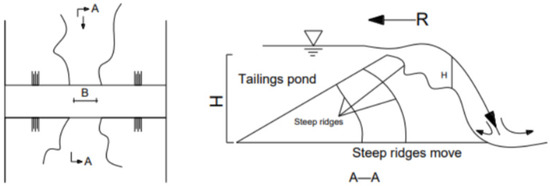 In terms of dam break research, Yekti et al. [1] simulated that overtopping is the most dangerous, with the highest flow velocity and flow rate. Chen et al. [2] simulated the development of notch erosion using the time iteration method in mathematical models. A stability analysis was conducted on the reinforced cracked slope using the limit equilibrium method, and then physical tests were used to reproduce the process of tailings dam failure. Dumergue et al. [3] conducted numerical analyses of different wave impacts generated by wet dams by changing the downstream depth and obstacle position. Mattas et al. [4] used HEC-RAS software (Hydrologic Engineering Centre—River Analysis System) to simulate the dam breaking process and flood wave trend using two-dimensional numerical models for two types of failure scenarios. In terms of debris flow caused by dam failure, Aleixo et al. [5] used PIV and PTV to measure the velocity field of sand containing water flow in tailings dam failure and obtained the velocity characteristics of sand containing water flow in tailing dams. Schaefer et al. [6] conducted model experiments to study the flow velocity characteristics of sand containing water flow in dam breaks under various terrain conditions. The study found that shape has a significant impact on the flow velocity of sand containing water flow, and different terrain roughness also affects the flow velocity distribution of sand containing water flow. Sanchez Perelta et al. [7] studied the characteristics of dam break debris flow movement using dry tailings mixed with different water contents and obtained the relationship between the length and width of dam break debris flow movement. Gao et al. [8] used homogeneous mud to simulate the movement of dam break debris flow and measured the yield stress of the mud in a water tank, obtaining the variation pattern of the yield stress of homogeneous mud. Le et al. [9] used the volume of fluid method, the shear stress transport turbulence model, and the Lagrange particle tracking method to simulate the scouring process caused by dam failure. Hamza et al. [10] developed a flood inundation model using GIS technology and simulated the impact of the study area on flood wave propagation. Özgenç et al. [11] studied the propagation law of water waves in debris flows through dam breaking experiments. Yu et al. [12] focused on constructing a virtual geographic environment (VGE) system that offers an effective visualization tool for the dam-break process of a tailings pond. We integrated the dam-break numerical model of the tailings dam, which is based on computational fluid dynamics (CFD), into the VGE system. This integration proves valuable for assessing the risk associated with tailing dams. Chen et al. [13], in order to tackle the issue of serious defects suggested by the evaluation indicator value, established a three-layer indicator system for assessing dam failure safety. We also introduced the variable weight method (VWM) to evaluate the safety of the tailings dam. Ma et al. [14,15,16] proposed an anisotropic plastic model to describe the nonisotropic mechanical behavior of porous media. This model was developed using bounding surface plasticity theory within the critical state framework. Melo et al. [17] explored the sensibility of tailings dam breach flood mapping to rheological parameters in Bingham and Herschel–Bulkley (H–B) models. The developed approach was based on the probabilistic Latin hypercube sampling of rheological parameters.