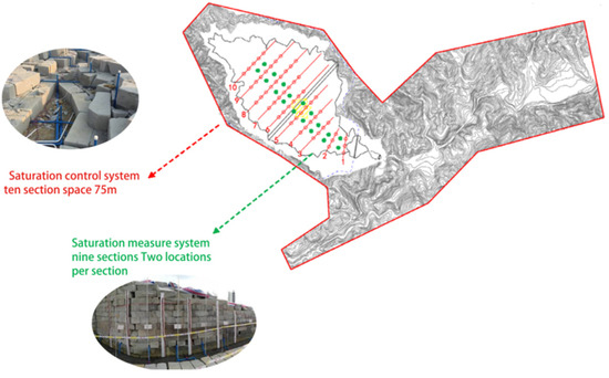 There existed a complex seepage field within the tailings dam, and its seepage path has a direct impact on both the static and dynamic stability of the dam. The seepage line, known as the “lifeline” of the tailings reservoir, was given special consideration in terms of layout and simulation within this physical model. As shown in Figure 7, a plum blossom-shaped seepage point was set up in the reservoir area, and the influence of the height of the seepage line on the stability of the dam body and the influence of different seepage failure points on the stability of the dam body were studied by controlling the section water head. The infiltration line control system in the model was primarily situated along the valley floor, consisting of 10 sections spaced at intervals of 0.5 m between each section point. The infiltration line measurement system was positioned between the two aforementioned sections, comprising nine segments with two locations for each segment.