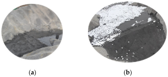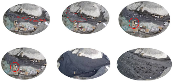 The dam break model exhibited a significant drop and possessed a large potential energy. Following the rupture of the dam, water stored in the reservoir was released rapidly, carrying with it a substantial amount of tailings. The flooded area of tailings discharged under the dam break is shown in Figure 19. The total plane area of the silting area is about 24.8 m2, equivalent to 0.558 km2 in the prototype, and the total collapse volume of tailing sand was 3.85 m3, about 1300 × 104 m3 in the prototype, accounting for 14% of the total storage capacity. The sedimentation at the base of the dam accounted for 36% of the total drainage volume, followed by the Shizhou residential area, river area, and Shangdi village. Additionally, approximately 9.1% of the total drainage volume flowed into the lower reaches of Shizhou Village.