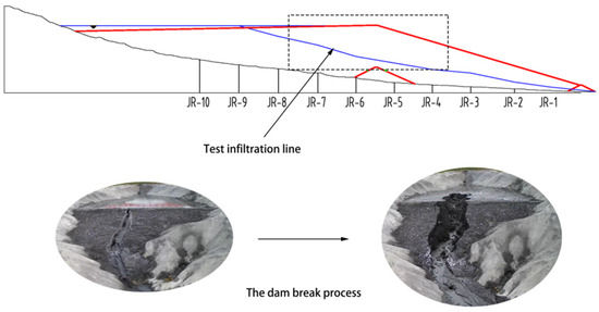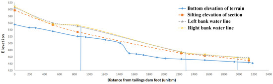 In order to achieve a physical model that closely resembled the middle-line dam stacking method, the sand used in the model was sieved during the stacking process. A fine particle model sand was utilized upstream of the dam axis, while a relatively coarse particle model sand was employed downstream of the dam axis. The formal testing scenario assumed that the tailings dam failed as a result of flood overflow. Under these circumstances, the water level in the tailings reservoir area was at a critical state, meaning it reached its highest flood level, and the length of dry beach was only 0.67 m (100 m in prototype). In this condition, any potential PMF event could result in an overtopping dam break. Table 10 and Figure 14 demonstrate the buried depth of the wetted line in the initial state of the physical model, which was controlled and adjusted through the wetted line system of the tailings dam.
