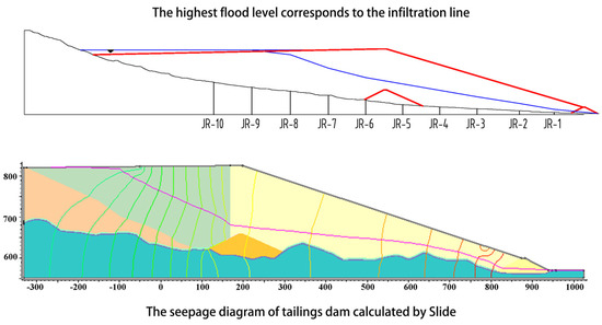 By comparing the seepage flow results of flood operation at the final accumulation elevation calculated by Slide software (V 6.0), adjustments could be made to the wetting line system in order to ensure that the state of the wetting line in the physical model was essentially consistent with that of the prototype.