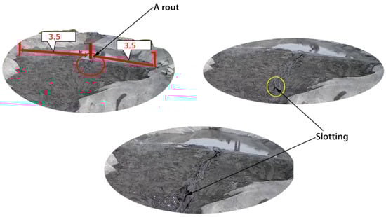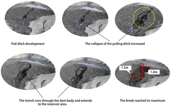 At 09 min 46 s, the ditch was obviously pulled, the local (weak) wall of the ditch collapsed, and water trickled down. The gully was deep, but the width was not significantly increased; the gully was slowly formed with the tailing sand in the reservoir area. At 10 min 00 s, the ditch continued to expand deep, cracks appeared along the edge of the ditch wall, and the collapse degree increased.