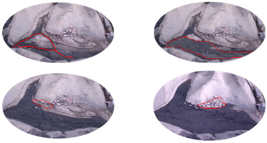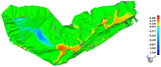 At 11 min and 45 s, the water flow began to affect several houses located below the left bank’s elevation of 450 m in the direction of its current. At 19 min and 46 s, as the flood area of the water sand flow rose and approached an elevation close to 457 m, most houses were inundated. As shown in Figure 18.