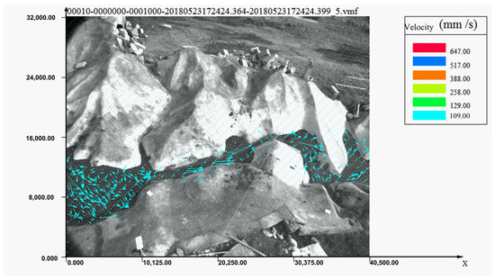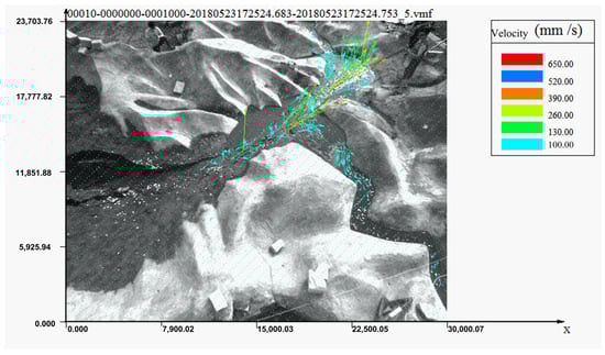 According to the flow field vector diagram of the canyon section between Shangdi Village and Shizhou Village, the velocity of dam-broken water and sand flow decrease after passing Shangdi village, with a range of 137–274 mm/s or 1.68–3.36 m/s in prototype scale. The flow velocity of the collapsing body was impeded by the obstruction caused by the flow velocity in the upper reaches of Shangdi village and the dissipation of fluid kinetic energy in the open area of the Shangdi settlement, as shown in Figure 22.
