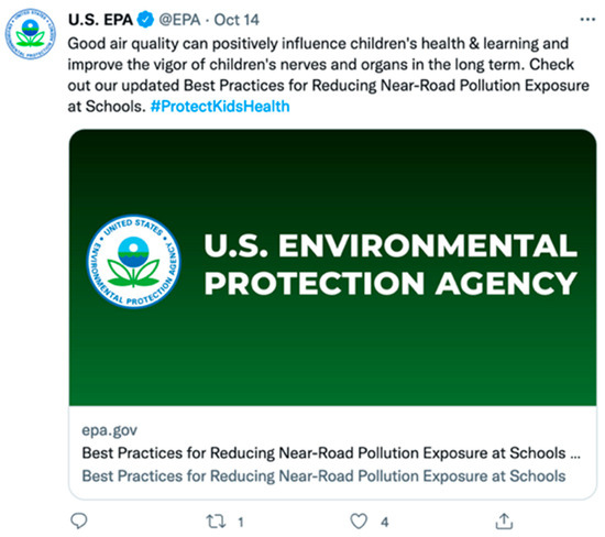 A series of mock tweets (i.e., screenshot pictures of tweets) were created based on an actual tweet posted by the U.S. EPA. The tweet either described an environmental issue from a negative angle if we do not protect the environment (loss) or a positive angle if we protect the environment (gain). Moreover, the numbers of retweets (1 vs. 1100), likes (4 vs. 14,000), and comments (0 vs. 962) were manipulated since they are indicators of bandwagon support levels. The account name, profile picture, and linked article remained constant across four conditions. The tweet and the associated article discussed the issue of roadside air pollution. Note that all topics of the tweets used in the experiments were selected based on their significance defined or discussed by the EPA [59]. Please see Figure 1 for an example of stimuli.