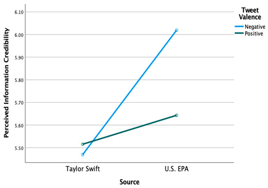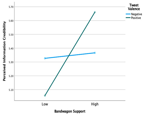 The manipulation of the bandwagon support level was successful t(272.064) = −7.540, p < 0.001, and the manipulation of tweet valence was also successful t(274) = −7.521, p < 0.001. Two-way ANCOVA tests were performed to examine the proposed hypotheses. The intention to read the tweeted article was significantly predicted by the bandwagon support F(1, 271) = 4.390, p = 0.037, partial η2 = 0.016. A post-hoc analysis with Bonferroni adjustment suggested that participants had a stronger intention to read the article when the tweet’s bandwagon support metrics were high (M = 4.792, SE = 0.132) than when they were low (M = 4.406, SE = 0.129). For the intention to retweet, the main effect of the bandwagon support F(1, 271) = 4.957, p = 0.027, partial η2 = 0.018 was significant. The post-hoc test revealed that participants were more likely to retweet when the bandwagon support was high (M = 4.026, SE = 0.129) than when it was low (M = 3.623, SE = 0.126). Regarding the perceived information credibility, the influence of the bandwagon variable was significant F(1, 271) = 7.841, p = 0.005, partial η2 = 0.028. Participants were more likely to trust the information when the bandwagon support was high (M = 5.514, SE = 0.082) than when it was low (M = 5.129, SE = 0.080). On the other hand, the interaction effect between the bandwagon support and tweet framing valence was significant F(1, 271) = 6.032, p = 0.015, partial η2 = 0.022. The bandwagon support levels positively affected the valence of the tweet’s impact on the perceived information credibility (see Figure 2). All other main effects and interaction effects were not significant (see Table 2).