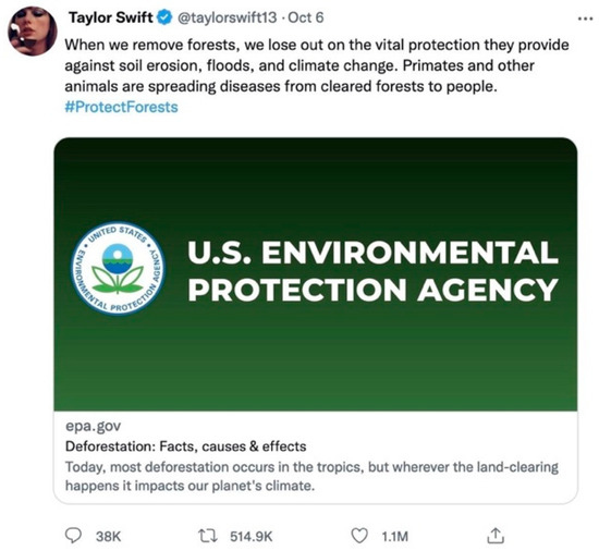 A challenge that environmental advocates and their communication campaigns face is to entice and engage potential target audiences. To many people, educational information about environmental protection seems uninteresting. Fortunately, there are various ways that environmental advocates (or organizations) can employ to entice and engage audiences. One of the simple techniques is employing an entertaining figure, such as a celebrity, to serve as a spokesperson (or a source) for the communicated information. The goal of using such a figure is to utilize a celebrity’s charismatic image with the hope that audiences may unconsciously associate the image with the message posted by the celebrity. Empirical studies have shown the success of using celebrities as campaign ambassadors in brand-consumer communication [7,8]. However, the efficacy of the practice in the context of environmental communication is debatable [9]. Thus, the main goal of the current research is to empirically ascertain the effectiveness of employing celebrities as a source of information in environmental communication campaigns on social media.