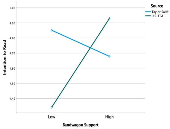 In the fourth study (Study 3), the bandwagon support variable significantly affected audiences’ intentions to share the tweet and read the tweeted article. This, once again, acknowledges that when the manipulation is successful, the bandwagon effects are prevalent and significant [24,41]. Moreover, the significant interaction effect between bandwagon support levels and source types on the intention to read the article unearthed by Study 3 indicates that bandwagon cues can potentially elevate the image of a source and motivate an individual to think or behave in a certain manner. Such an enhancing effect is more notable when the source (e.g., U.S. EPA) is considered more credible by message receivers.
