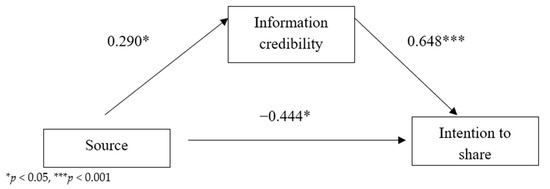 Moreover, extant studies suggest that perceived information credibility affects behavioral intention either as a predictor [12] (or as a mediator [55,56]. Konig and Breves [12] unearthed a significant influence of perceived information credibility on individuals’ intention to read and share information. Balaji and colleagues [55] discovered that message credibility was a significant mediator that affected one’s intention to adopt a service and follow an influencer. Jaeger and Weber [56] found that message credibility mediated the influence of advertising message types on consumer intention to purchase organic food. The main focus of the current research is on the impact of information sources on audiences. The mediation effects that involve source type (i.e., source credibility), perceived information credibility, and behavioral intention were investigated. The following hypotheses were posited based on the findings of the reviewed research.