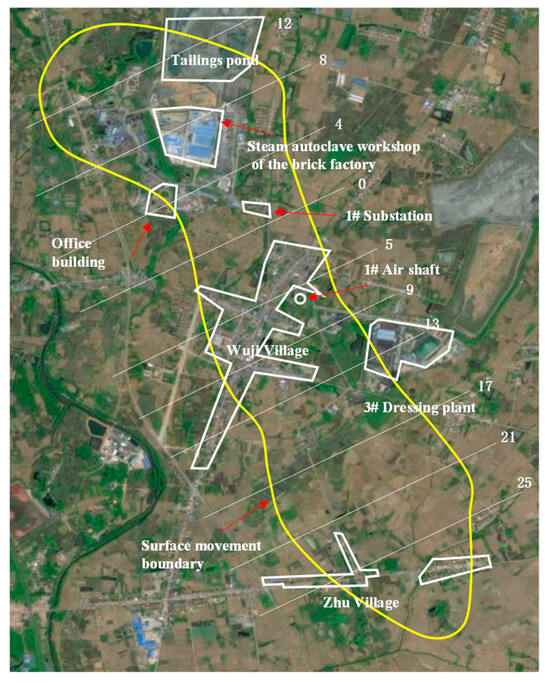 Within the boundary of the surface movement of the Wuji iron mine, there is a large number of mine-owned buildings and villages. Figure 1 shows the overall distribution of buildings and villages. The numbers in Figure 1 represent the exploration line. If the traditional method of retaining safety pillars is used to protect surface structures, the long-term development of the mine will be hindered. As the mining activities gradually extend deeper, the retaining scope of the safety pillars becomes larger, until almost all deep ore bodies in the mine are within this scope of safety pillars. According to satellite images, there are nearly one thousand private houses in Wuji village alone. If the scheme of relocating surface villages and industrial buildings is adopted, it will lead to huge labor costs and substantial economic and time expenditures, which will directly affect the normal production of the mine. To improve the effective utilization of mineral resources, appropriate mining methods should be selected to reduce the impact of mining on surface deformation.