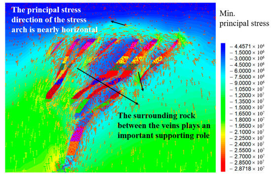 - The stress concentration occurs at the top of the ore body and in some surrounding rocks between the ore veins. This is mainly because the rock mass between the ore veins supports the top surrounding rock, and the direction of the principal stress is consistent with that of the main bearing capacity of the rock mass. Therefore, the surrounding rocks of the hanging walls and footwalls of ore veins should be protected to reduce damage to the surrounding rock caused by blasting during the mining process.