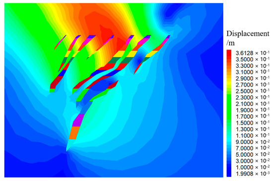 Figure 4 and Figure 5 show the stress vector and displacement of the Wuji iron mine, respectively. It can be seen that reduction in the principal stress occurs in the surrounding rock of the hanging wall of the ore body, and the stress concentration occurs in the top of the ore body and some surrounding rocks between the ore veins. The direction of principal stress in the stress concentration area at the top of the ore body is nearly horizontal, and that of the rock mass between the ore veins is in the inclined direction of the ore body. The stress concentration at the top of the ore body is mainly caused by the rock mass in ore veins supporting the surrounding rock at the top, indicating that the rock mass in the ore veins bears a certain amount of upper rock load. The direction of the principal stress is the direction of the main bearing capacity of the rock mass, indicating that the surrounding rock in the ore veins plays an important supporting and protective role in the mining process. Therefore, the surrounding rock of the hanging wall and the footwall of the ore vein should be protected to reduce the damage caused by blasting to the surrounding rock during the mining process.