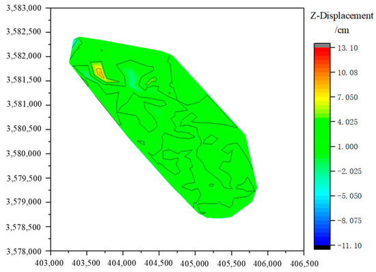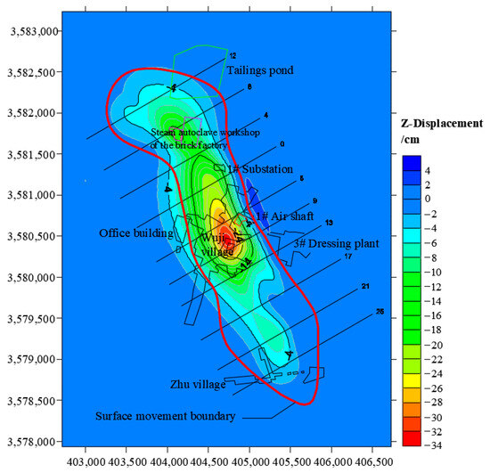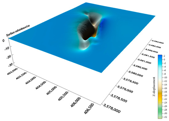 The mining of ore bodies causes the displacement and deformation of surrounding rock, and when the displacement of surrounding rock develops and reaches the surface, subsidence and deformation can be caused. To scientifically analyze the impact of underground mining on the surface buildings and structures at the Wuji iron mine, a surface subsidence cloud map of the Wuji iron mine was simulated, as shown in Figure 7. The relevant displacement data were extracted, and Tecplot, Sufer, and other software types were applied for data processing. Finally, the three-dimensional diagram of land surface subsidence was obtained, as shown in Figure 8.