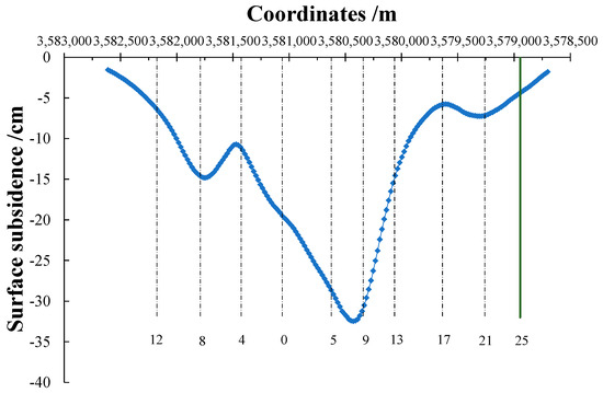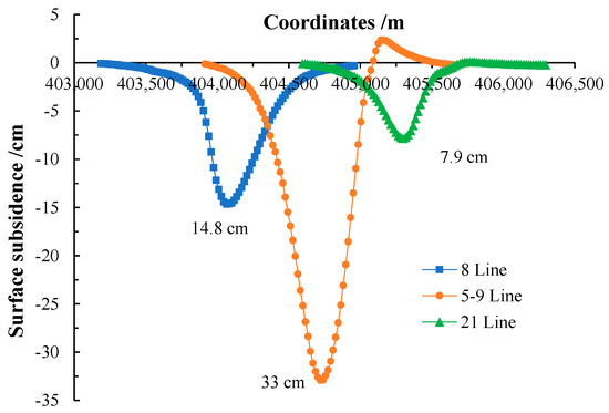To further observe the changes in surface subsidence, cross-sections of subsidence were made along lines 8, 5–9, and 21, and longitudinal sections were made along the surface subsidence area, as shown in Figure 9 and Figure 10. There are three extreme points of surface subsidence in space, which are located near the steam autoclave workshop of the brick factory (line 8, 14.8 cm), the center of Wuji village in the central area (lines 5–9, 33 cm), and in the southern area (line 21, 7.9 cm). The amount of surface subsidence is the greatest at lines 5–9, and the monitoring of surface subsidence should be strengthened at these positions. The surface subsidence increases in line 8 and line 21, which means that further detection and monitoring are required at this location. Additionally, the reasons for the increase in subsidence should be analyzed to ensure safe mining under buildings.