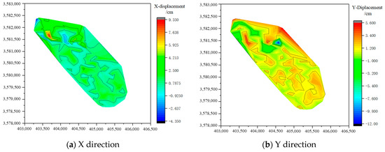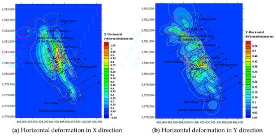 The horizontal deformation of the surface has a significant destructive effect on buildings, especially the impact of tensile deformation. Figure 11 shows the cloud map of surface horizontal displacement in the X and Y directions, while Figure 12 shows the cloud map of surface horizontal deformation in the X and Y directions. It can be seen that there are two extreme points for horizontal displacement and deformation in the X direction, located near the steam autoclave workshop of the brick factory (line 8) and in the center of Wuji village (lines 5–9). The extreme points of horizontal displacement and deformation in the Y direction are located near the filling station (line 8), near the 1# air shaft (line 5), and in the center of Wuji village (line 9). Although there are fewer extreme points for horizontal deformation in the X direction, the deformation value is greater than that in the Y direction. The maximum horizontal deformation values in the X and Y directions near the steam autoclave workshop are 1.05 mm/m and 0.47 mm/m, respectively. This is mainly because the distribution pattern of horizontal deformation on the surface is closely related to the occurrence status of ore bodies, and the extreme point of deformation mainly appears in the upper wall of the inclined ore body and the edge of the horizontal ore body. The ore body in the Wuji iron mine ranges from tilted to steeply inclined, and has a SW–W tendency. Horizontal surface displacement frequently occurs on the hanging wall of the ore body, mainly in the SW–W direction. Therefore, the surface displacement in the X direction is relatively large, while the displacement in the Y direction is relatively small. According to the relevant provisions of the Code for Design of Nonferrous Metal Mining, the above surface deformation values are all lower than the allowable critical deformation value of buildings and structures by 2 mm/m.