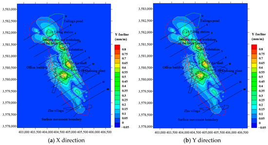 The ground inclination can cause the center of gravity of buildings to shift. This not only affects the stability of the building, but also causes additional stress inside the building and the redistribution of the bearing capacity of the foundation. Figure 13 shows a cloud map of the surface inclination. It can be seen that the distribution of surface inclination is related to the ore body. The surface inclination in the X direction is distributed in a strip along the direction of the ore body, while that in the Y direction displays a block-like distribution. There are two extreme points in the surface inclination of the X direction, which are all located near line 5. One is from the 1# air shaft to Wuji village (1.24 mm/m), and the other is in the central area of Wuji village (0.87 mm/m). There are four extreme points in the surface inclination of Y located near the steam autoclave workshop of the brick factory (lines 4–8, 0.71 mm/m), the 1# substation (line 0, 0.76 mm/m), the 1# air shaft (line 5, 0.66 mm/m), and the southeast of Wuji village (lines 9–13, 0.69 mm/m). Although there are fewer extreme points of surface inclination in the X direction than in the Y direction, the extreme values in the X direction are all greater than those in the Y direction. According to the relevant provisions of the Code for Design of Nonferrous Metal Mining, the above surface deformation values are all lower than the allowable critical deformation value for buildings and structures by 3 mm/m.