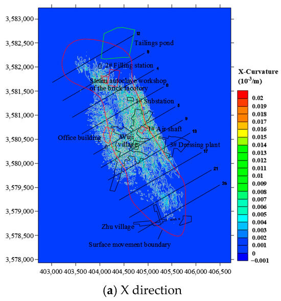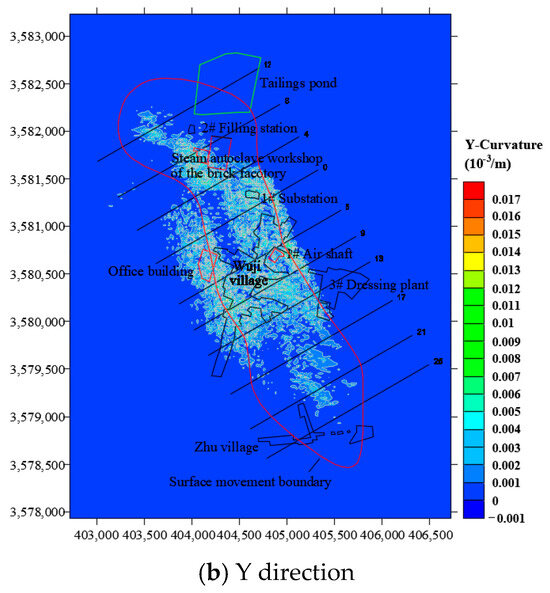 Surface curvature represents the degree of change in surface inclination. The existence of surface curvature makes the surface change from its original plane to a curved surface, and then causes the redistribution of foundation reactions in buildings and structures, changing from the original uniform foundation reaction and forming loading and unloading zones. Figure 14 shows the cloud map of surface curvature in this mining area. It can be seen that the distribution range of surface curvature in the mining area is relatively large, but there are no exact extreme points of the surface curvature. The maximum curvature of the mining area in the X direction is 0.02 × 10−3/m, and that in Y direction is 0.017 × 10−3/m. According to the relevant provisions of the Code for Design of Nonferrous Metal Mining, the above surface deformation values are all lower than the allowable critical deformation value of 0.2 × 10−3/m for buildings and structures. Therefore, the damage caused to buildings by the underground mining activities would be relatively small.