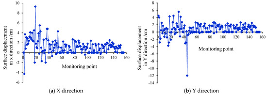 According to the surface displacement monitoring data of the mine from June 2021, the settlement and horizontal displacement of each monitoring point were plotted, as shown in Figure 16 and Figure 17. Due to the large number of monitoring points, some monitoring points were selected longitudinally along the ore body. The maximum subsidence value is 11 cm with local fluctuation, and the maximum fluctuation value is 13 cm. The maximum surface displacement in the X direction of the mining area is 8 cm, and that in the Y direction is 12 cm.