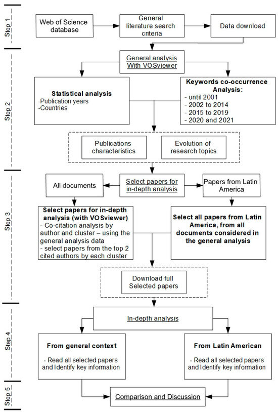 The in-depth analysis involves reading and identifying key elements and information from the selected papers, with special attention to methodological aspects, case studies, and general conclusions. It is important to highlight that the analysis at this stage focuses on comparing the general and Latin American context. Finally, there is a general discussion about all the achieved results and analysis, emphasizing the barriers and opportunities for sustainable mobility studies in Latin America. Figure 1 gives an overview of the steps taken for this research.