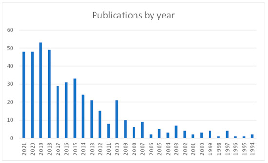 When observing the share of publications by year (Figure 2), it is possible to realize the growing importance of the theme, with a period of slight growth between 1994 and 2007, and after 2007 a considerable increase in the volume of publications. After 2013, the volume reached 20 publications per year and never returned to this line. Additionally, 2019 was the year with the highest number of publications, surpassing the mark of 50 publications. More than observing the higher peak of publication, it is significant to observe cyclical publication patterns with a general growth over the years, which could relate to the neo-Schumpeterian economic theory [17]. Therefore, it is possible to notice moments of peak, downfall, and growth, which can be related to the evolution of global concerns related to environmental, economic, and social development issues. In the 90s, there was growing discussion about the environmental impact of industrialization and urbanization, while between 2001 and 2014, there was the proposal of MDGs with an environmental, social, and health focus. In 2015, the United Nations presented the SDGs, increasing the dimension of sustainable development concerns, including a higher diversity of goals. In addition, the downfall of data in 2020 is possibly due to the emergence of the COVID-19 pandemic, shifting slightly the focus of academics’ concerns.