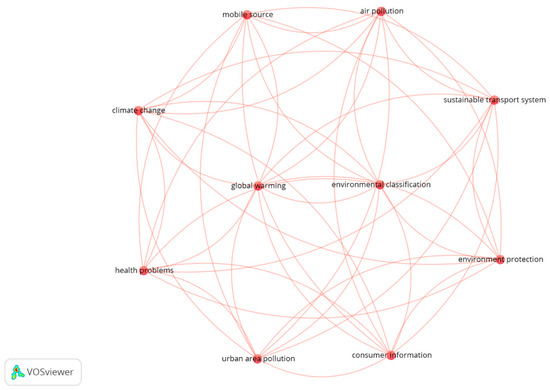 In the first period, which goes until 2001 (Figure 4), we can see a significant co-occurrence of keywords related to “climate change”/“global warming” issues, as well as other environment threads related to transport such as “air pollution”, “urban area pollution”, and “health problems”. “Environment protection” and “environment classification” suggest the path of action chosen by the authors in this period. Finally, it is relevant to highlight that the “sustainable transport system” at this stage shows a stronger relationship with “air pollution”, “environmental classification”, “urban area pollution”, “climate change”, “global warming” and “health problems”.