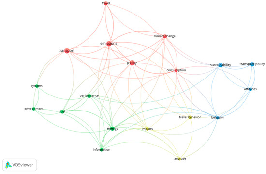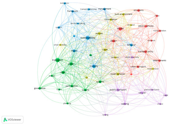 In the 2015–2019 period (Figure 6), we notice a profusion of articles, demonstrating the rising importance of “sustainable transport” research. “Sustainability” and “transport” are sovereign in this chart, followed by “policy”/“policies”, “cities”, “transport” and the word “mobility”, which appears here for the first time. We can also see the emergence of the words “governance”, “planning” and “participation” in the green cluster, while the blue cluster presents the keywords “management”, “transport planning” and “planning” alone. However, in the blue cluster, the words “system”, “indicators”, “framework”, and “decision-making” suggest a path of action in this period. The purple cluster presents concerns over “car use” and the modal choice, regarding active and public modes of transport, represented by the words “cycling”, “walking”, “choice”, “habit”, “physical activity” and “planned behavior”. The transition from purple to yellow cluster follows the issues of “travel behavior”, “mode choice”, “travel” and “car”, changing gradually to spatial factors such as “land use” and “built environment”, and socioeconomic factors such as “consumption” and “demand”. The red cluster brings the words “determinants”, “adoption”, “model” and “design” which can also suggest a path of action, while “China”, “emissions”, and “electric vehicles” suggest new concerns over the transport pollution subject.