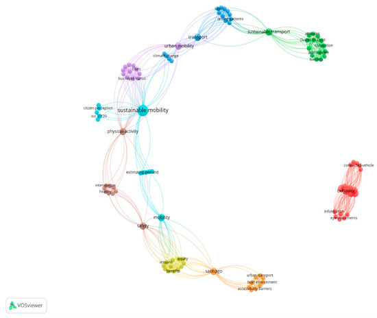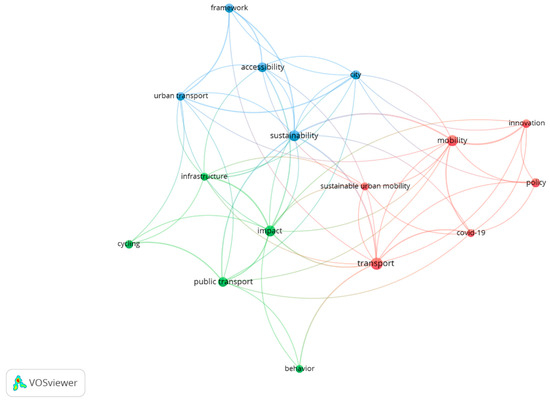 In the last period, from 2020 to 2021 (Figure 7), we see the centrality of “sustainability” and “transport”, followed by “mobility” and the composite keyword “sustainable urban mobility”, which conjugates important previous ones. Notwithstanding, the word “COVID-19” appears in the red cluster and “innovation“, which could suggest the growing concern over a paradigm-breaking necessity preceded by the pandemic. In the blue cluster, “urban transport”, “accessibility”, “framework” and “city” are relevant. In contrast, in the green cluster, we can see the prevalence of transport behavior-related words, such as “cycling”, “impact”, and “behavior” and transport planning issues, such as “public transport”, and “infrastructure”.