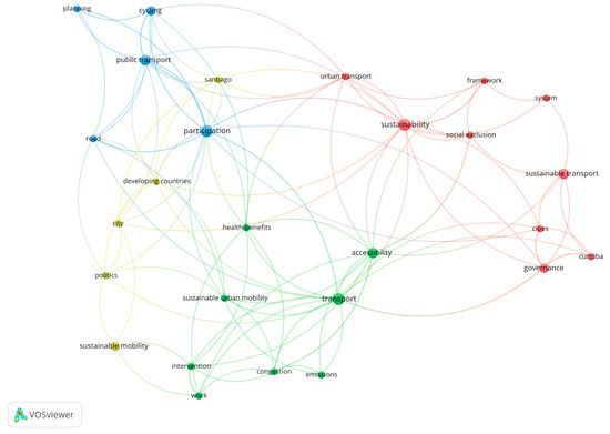 Figure 8 presents the co-occurrence of keywords from the selected papers from Latin America regarding all time. Here, we can outline the keywords “sustainability”, “participation”, “transport”, and “public transport” as the major ones. The conjugated keywords “sustainable transport” and “sustainable mobility” also play an essential role in their clusters. Regarding public transport, “cycling” appears sovereign as the unique modal mentioned. Therefore, other words are presented here that we do not see in the general charts: “developing countries”, “santiago”, “curitiba”, which represent the case studies undertaken; but also “social exclusion”, “work”, and “intervention”, that are main issues in Latin America transport landscape. Other words that have recurrence here are: “system”, “framework”, “cities”, “urban transport”, “congestion”, and “emissions”. It is interesting to notice that the word “politics” differs from the previous “policy” or “policies”, which can suggest the complexity of the political environment in Latin America, which is certainly a challenge in all the papers analyzed. It is interesting to observe that participation is a key term that connects all clusters, with strong links, for example, to “public transport”, “planning”, “sustainability”, “governance”, “developing countries”. It could be seen as a precondition to developing, for example, better planning and public transport with more public acceptability, leading to sustainable mobility, closer to the definition of Banister [6].