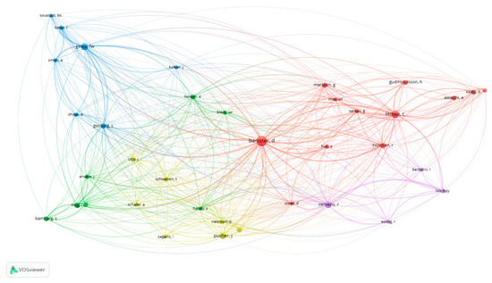 Figure 9, produced with the VOSviewer software with citation data from all 444 articles, shows that Banister is the author with a more robust connection among the conjunct. It demonstrates the global reach of their publications. Although the second-most cited author, Litman, has a stronger connection with the blue and purple clusters and weaker with the green and yellow ones. Pucher is the third most cited. Although Pucher has no strong links with red and blue clusters, this author was selected in the yellow cluster for the in-depth review, and so was Litman for the red cluster and Buehler for the same yellow cluster.