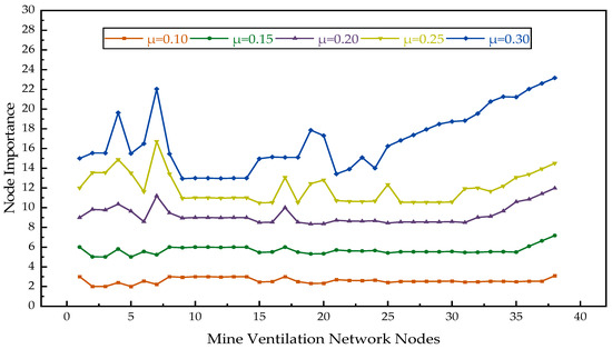 Finally, the entropy weight method (EWM) is used to establish matrix and standardize it. The variation degree of the two indicators is calculated to obtain the weight, and the node importance is obtained by summing the rows. Figure 2 shows the node importance of the ventilation network under different constraint values.