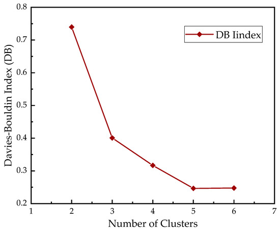 When the clustering algorithm (CA) is used to locate the monitoring nodes, the value of the clustering number needs to be set first. Combined with the specific situation of the underground ventilation system, the minimum clustering number can be determined. Referring to the method of setting the number of clusters in [46], the maximum number of clusters in the cluster partition is . In this paper, the Davies_Bouldin Index (DB index) is used to evaluate the clustering results. The smaller the index value, the better the clustering partition effect [47].