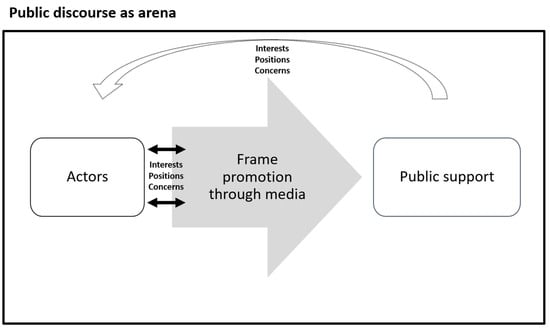 Drawing on communication research, we hold that framing involves a horizontal and a vertical dimension. In this model, frames occur in different arenas such as the media system, political system, society, or counter publics (horizontal dimension) [31] (p. 111). Moreover, frames can be located on different levels such as a cognitive, discursive, or textual level (vertical dimension). Following these assumptions, we argue that agents and frame entrepreneurs “[…] promote specific frames in order to gain public support for their interests, positions, and concerns” [31] (p. 111). We thus apply a public discourse or social movement approach with a macro focus [32,33] Through this lens, we identify political actors and examine to what extent these can (successfully) launch their frames in the media. The latter are merely seen as carriers of frames promoted by specific agents. Our approach thus considers the content of media as an indicator for the public discourse which affects public support (see Figure 1). In this arena, actors engage in frame promotion through media outlets in order to gain public support. These promotion processes are inspired by the interests, positions, and concerns these actors have. Likewise, actors engaging in these framing processes are shaped, as we assume, by the interests, positions, and concerns present in the public and understanding of the recipients of framing processes feeds back into the senders’ (actors’) understanding.