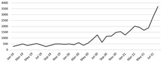 All available reports were searched for on a broad basis to capture a full picture of the discourse. As we used the query “[European Union] AND [Hydrogen]” for the period from January 2019 until August 2021, the mostly English reports gather the discourse during a period in which the EU published its hydrogen strategy (in July 2020), and show the growing emphasis put on the energy carrier. During this period, the salience of hydrogen increased—with a small peak around the publication of the EU’s hydrogen strategy—and further increased in the following months and years (see Figure 2).