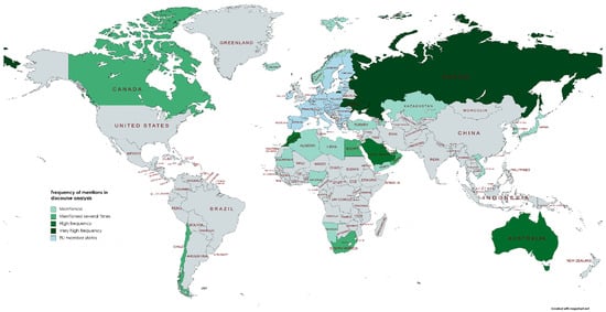 To engage with the discourse on hydrogen in terms of external partners, the reports were structured for each month and coded using the software atlas.ti, version 23. Based on a coding system that draws to some extent on previous research [15,16,41] and includes both inductively and deductively collected accounts, 350 codes on actors and various aspects of debates on hydrogen such as its application, color, or generation were developed [41]. Most of these codes refer to actors that have engaged in the debate (n = 247). The codes are generated and applied to enable a systematic analysis of the text material while also providing space and flexibility to include framing processes. For the purpose of this analysis, codes on external partner countries and relations to them are particularly relevant.