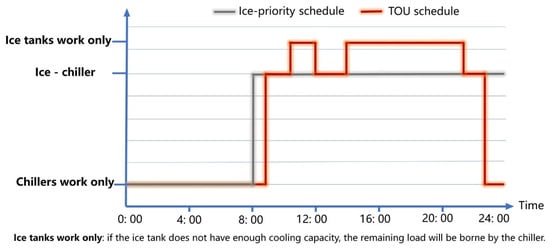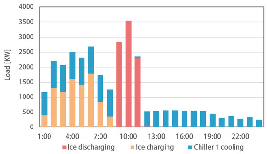 In the initial configuration of the ice storage system, the chiller’s capacity ratio is specified at 0.35. The simulation involves the use of two kinds of schedules. The simulation results are shown in Figure 19.