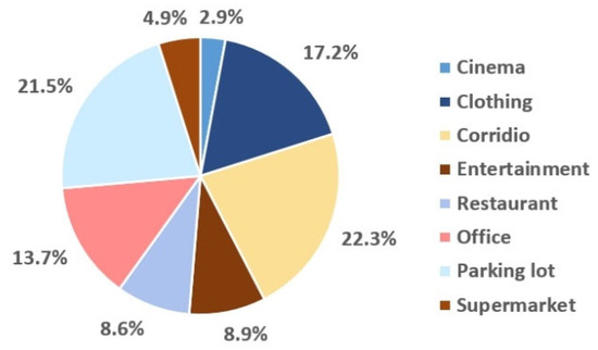 The case study building selected is located in Changsha, China, which is a hot summer and cold winter region with high humidity throughout the year. The mall has a floor height of 4.7 m. The first floor of the building has windows, with an east window-to-wall ratio (WWR) of 0.35, south WWR of 0.56, west WWR of 0.35, and north WWR of 0.3. The building area is 209,591 m2. The interior space of the building is divided into eight functional types: parking lot, catering, office, cinema, corridor, clothing, supermarket, and catering. The area of each functional type is shown in Figure 6 and Figure 7.