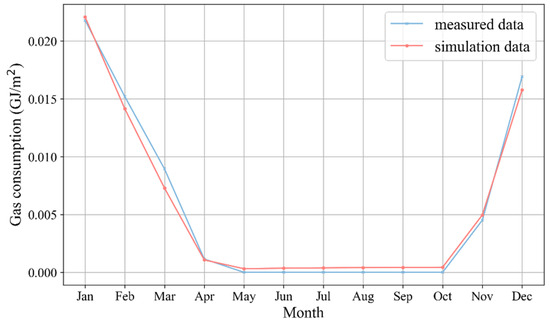 According to Formulas (3) and (4), CVRMSE and NMBE values for energy consumption data and natural gas data were calculated separately. The CVRMSE values for electricity consumption and natural gas are 8.6% and 12.9%, respectively, both less than 15%, while NMBE values are 1.57% and 1.24%, respectively, both less than 5%. These values are within a reasonable range.