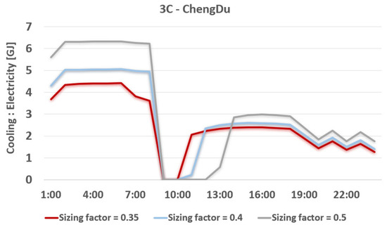 Among the 11 cities studied, the effects of altering the parameters of Chengdu’s model are the most preeminent due to it having the highest cooling load and the highest energy consumption. Therefore, we use Chengdu as an example, study the hourly energy consumption of the baseline model of the shopping mall and the ice storage model on 21 July, and change the control parameters of the ice storage system to observe the changes, to study the effect of different parameters on the ice storage system.
