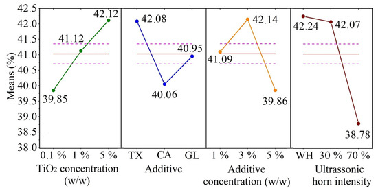 | Trails | Initial TiO2 Concentration (wt.%) | Additive | Additive Concentration (wt.%) | Ultrasonic Horn (Intensity %) |