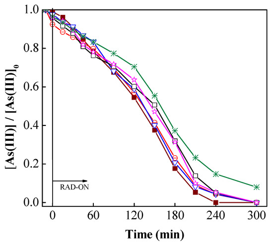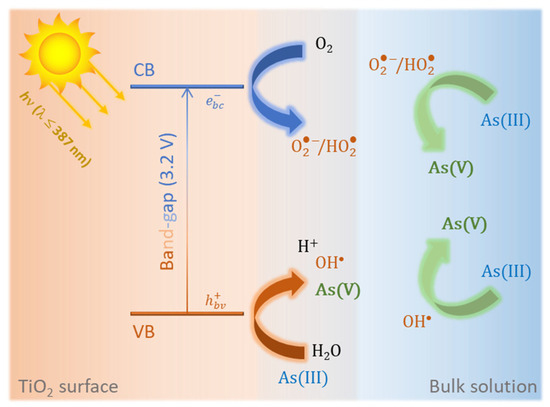 - Meichtry, J.M.; Levy, I.K.; Mohamed, H.H.; Dillert, R.; Bahnemann, D.W.; Litter, M.I. Mechanistic Features of the TiO2 Heterogeneous Photocatalysis of Arsenic and Uranyl Nitrate in Aqueous Suspensions Studied by the Stopped-Flow Technique. ChemPhysChem 2016, 17, 885–892. [Google Scholar] [CrossRef]