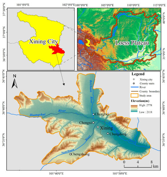 The study area is located in the western part of the Loess Plateau, in the transition zone between the Qinghai–Tibet Plateau and the Loess Plateau (Figure 1). It is situated in the midstream valley basin of the Huangshui River, with an area of approximately 490 km2. The Huangshui River runs from west to east through the entire Xining City area. Under the control of fluvial erosion and deposition as well as tectonic movements, the study area has developed erosion tectonic low mountains and hills along with erosion–deposition river valleys and plains. This makes the topography of the study area show a pattern of high surrounding areas and a low center.