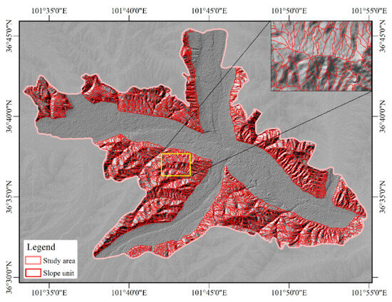 The evaluation unit is the basis for regional landslide stability assessment, with similar geological and geomorphological characteristics within the same evaluation unit. The slope unit is the basic geomorphological unit for landslide occurrence. This study takes the slope unit as the basic mapping unit for regional landslide susceptibility assessment and extracts slope units using the r.slopeunits method [49,50]. This method is based on the GRASS GIS platform and uses iterative and adaptive algorithms. By inputting DEM, plain data, flow accumulation area threshold (t), minimum slope unit area, and other parameters, slope units were obtained. A total of 2072 slope units were calculated in the study area, and the distribution of slope units is shown in Figure 5.