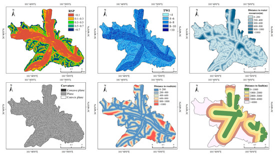 Landslides are the product of the combined effects of multiple factors including geology, geomorphology, climate, etc. Selecting suitable factors is the key to establishing a landslide susceptibility assessment. Based on previous research [8,10,20,51] and the actual conditions of the study area, nine factors were selected to construct the landslide susceptibility assessment index system, including slope, aspect, curvature, topographic wetness index (TWI), relative slope position (RSP), lithology, distance to faults, distance to rivers, and distance to roads. Among them, aspect, curvature, and lithology are discrete types, and the other factors are continuous (Figure 6). It is noteworthy that for the loess area, rainfall is an important factor in triggering landslides. It is undeniable that precipitation is a significant triggering factor for landslide development. The seasonal distribution of precipitation in Xining City is highly uneven, making the region susceptible to heavy rainfall, which in turn reduces slope stability and increases the likelihood of landslide occurrences. Considering the conditions required for precipitation, most precipitation events typically have a wide spatial extent. However, due to the limited size of our study area, covering only 490 km2, and the relatively minor spatial variability in precipitation, it has therefore not been included as an evaluation criterion in our study.
