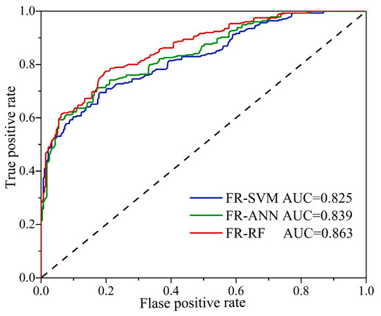 Figure 10 shows the confusion matrix for each model in the test set, where TPR, FNR, FPR, and TNR refer to true positive rate, false negative rate, false positive rate, and true negative rate, respectively. As shown in Figure 10a, the confusion matrix for the FR-RF model has a TPR of 84%, FNR of 16%, FPR of 20%, and TNR of 80%. The calculated accuracy and kappa coefficient are 0.825 and 0.649, respectively. The confusion matrix for the FR-ANN model has a TPR of 81%, FNR of 19%, FPR of 23%, and TNR of 77%. The calculated accuracy and kappa coefficient are 0.793 and 0.586, respectively (Figure 10b). As shown in Figure 10c, the confusion matrix for the FR-SVM model has a TPR of 79%, FNR of 21%, FPR of 25%, and TNR of 75%. The calculated accuracy and kappa coefficient are 0.773 and 0.545, respectively. The above analysis shows that among the three coupled models, the FR-RF model has the highest kappa coefficient, accuracy, and AUC, indicating it has the best fitting performance in this study and superior prediction capability compared to the other models.